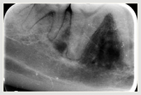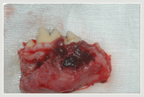 | Tumor im Unterkiefer | Zahnröntgen im Tumorbereich | Entfernter Kieferteil unter Tumor |